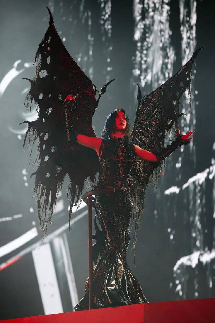 第二章“愉悦正在苦痛中回荡”中,蔡依林是妖媚性感的“魔女莉莉丝 ”,头顶巨型暗黑同党,亮面鱼尾服缀满柳钉,打扮来自纽约计划师品牌MAN MADE SKINS特地定制,搭配Nihai高跟鞋,MAN MADE SKINS也曾为BLACKPINK巡演定制过Lisa的制型。