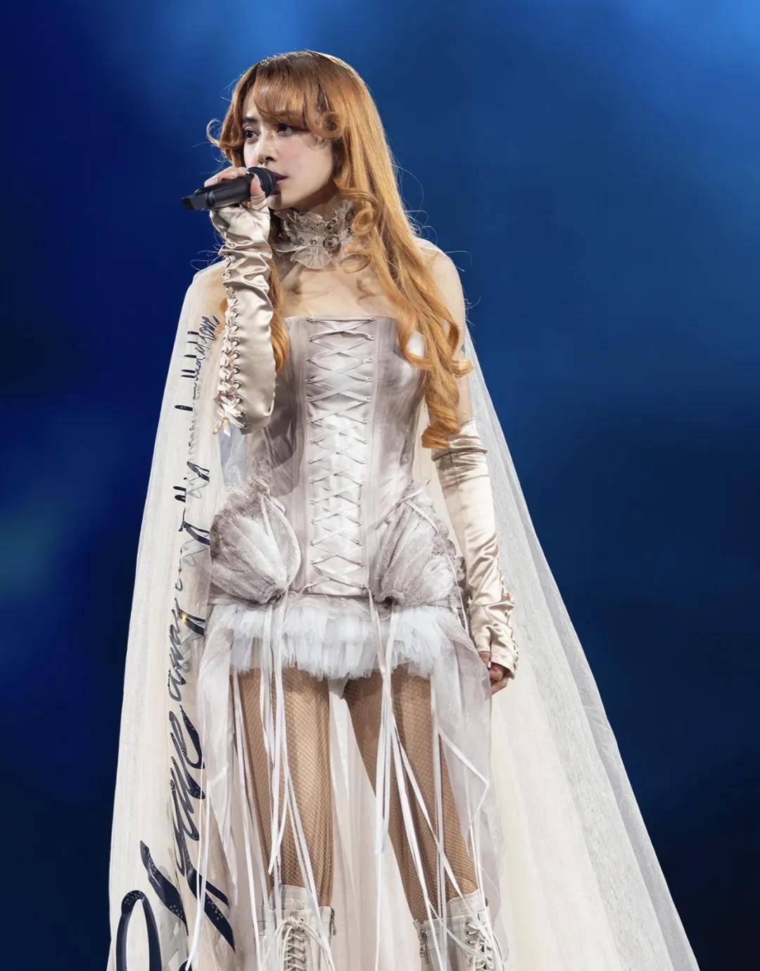 而正在拉开这套战袍的拉链后,蔡依林的第二套制型——以透肤马甲纠葛发丝的大胆妆饰跃然目下,打扮出自土耳其裔英邦计划师品牌 Dilara Findikoglu,搭配MM6 Maison Margiela X Salomon 运动鞋。Dilara Findikoglu刚拿下2025英邦时尚大奖前卫计划师奖,还曾为 Lady Gaga 的Mayhem巡演定制了制型。