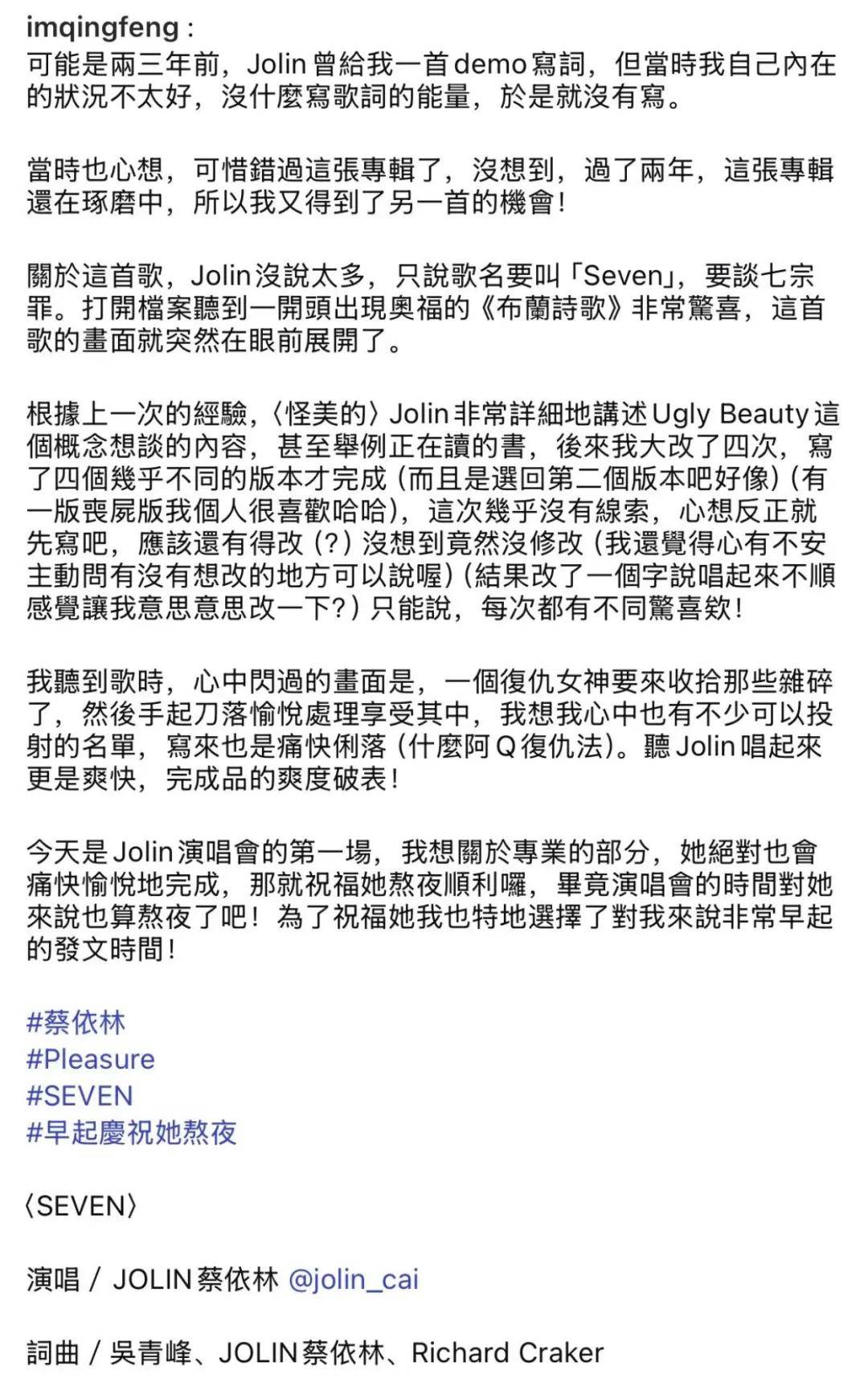 不仅是粉丝期望这场巡演,Jolin的稠密老友也给这场演唱会送上了花篮,吴青峰还专程宣告了祝愿长文,为此糟蹋“起了个大早”。