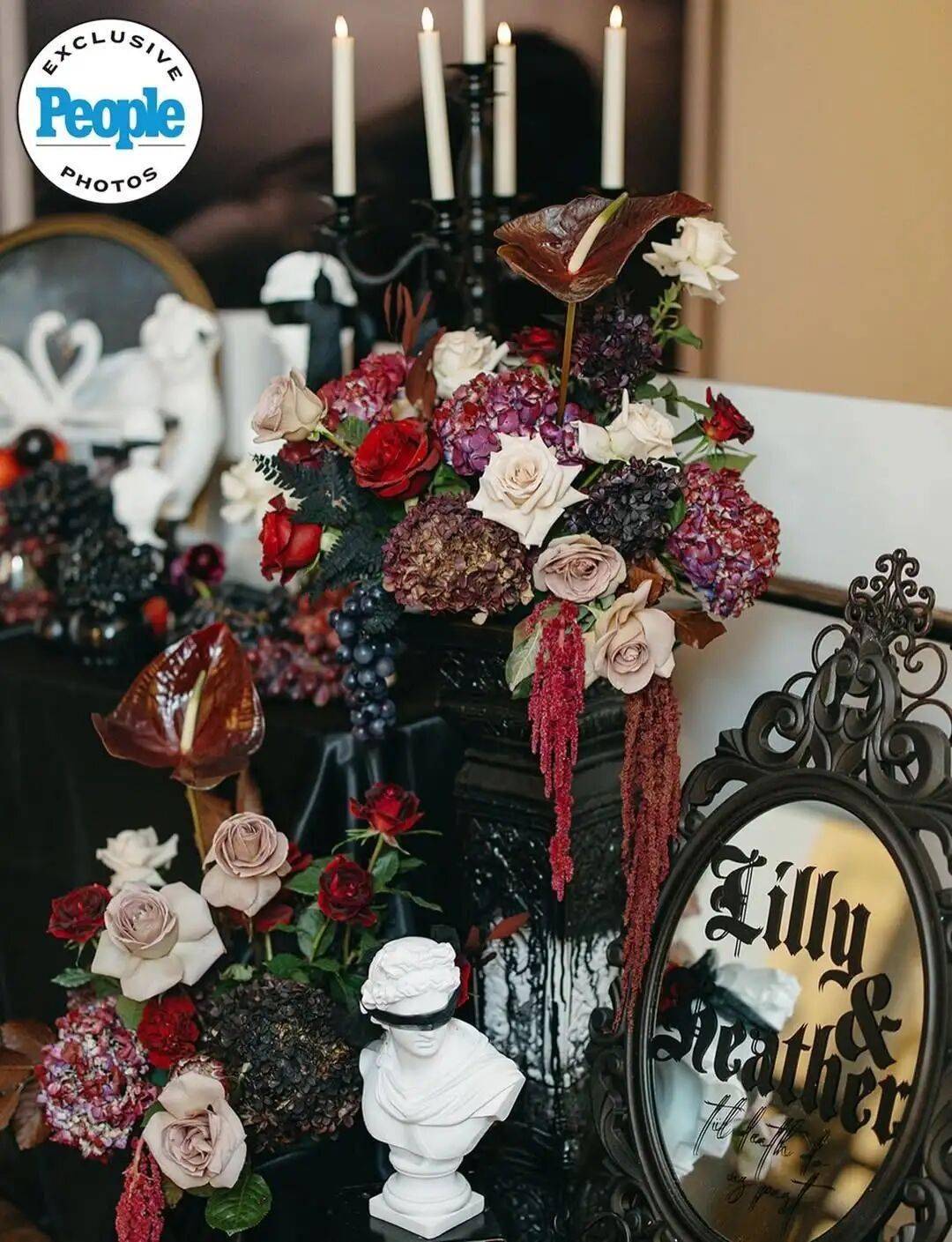 婚礼正在肯塔基州道易斯维尔的21c博物馆客店实行,整场典礼走的是“暗黑浪漫”道道,带着浓烈的哥特气氛,共有75位亲朋参与睹证。